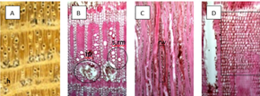 Figura: Secciones macro y microscópicas de A. marina. (A) Sección transversal-macroscópica; (B) Agrupación de vasos en sección transversal-microscópica: múltiplos solitarios (s) y radiales de 2 a 4 (rm), floema incluido (ip); (C) Sección tangencial-microscópica mostrando el ancho de rayo de 1-5 células (rw); (D) Sección radial – microscópica Sección radial – microscópica mostrando composición celular de rayos: heterocelular, 2-4 células prominentes con 1-2 filas erguidas o cuadradas (h). Barras de escala: 500 μm (A); 200 μm (B); 100 μm (C, D)