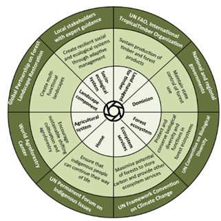 Figura: Diferentes objetivos de gestión forman la base a partir de la cual se conceptualiza un bosque y se crean definiciones. El círculo interior muestra cómo un bosque puede verse a través de diferentes perspectivas, emanando de los distintos objetivos de gestión mostrados en el círculo central. Cada objetivo ofrece una perspectiva desde la que se crean definiciones específicas. El círculo más externo describe instituciones cuya misión está asociada a cada objetivo de gestión y definición forestal.