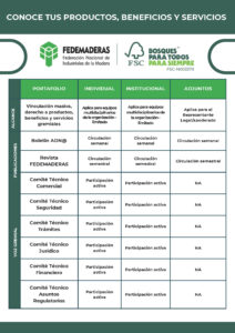 FEDEMADERAS, es  una organización de tipo gremial regida por el derecho privado que representa a los actores pertenecientes a la red forestal, de madera y mobiliario del país, mediante la articulación de cinco Consejos Sectoriales de la cadena de valor impulsando proyectos e iniciativas económicas, ambientales y sociales a través de la actividad agrícola de plantaciones forestales comerciales, conservación y aprovechamiento sostenible de bosques naturales, investigación y educación aplicada, servicios ecosistémicos y transformación primaria y secundaria de productos maderables y no maderables.