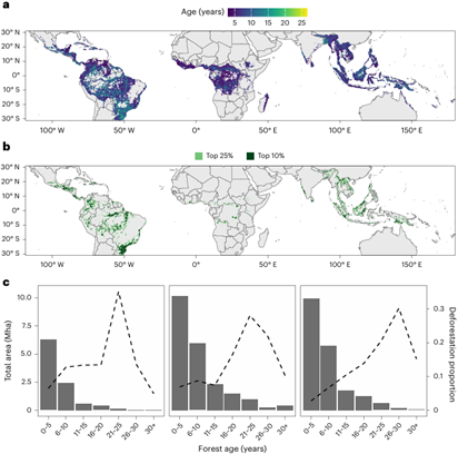 El artículo «The pan-tropical age distribution of regenerating tropical moist forest»  examina la edad y la distribución de los bosques húmedos tropicales (TMF) de regeneración natural y los factores que influyen en su longevidad . El estudio, que utiliza una serie temporal de datos de cobertura forestal de 1990 a 2023, cartografía la edad de los TMF en regeneración en todos los trópicos.