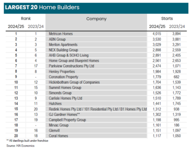 Metricon encabezó la lista por décimo año consecutivo con 4.015 inicios, con el constructor con sede en Victoria, ahora sujeto a una adquisición total por parte de Sumitomo Forestry, enorgulleciéndose «de construir todas sus casas con losas de hormigón y estructuras de madera». Mientras tanto, Henley Properties de Australia del Sur ocupó el octavo lugar con 1.984 inicios, y Redink Homes, también controlada completamente por Sumitomo, quedó en el puesto 15 con 1.312. Otros actores poderosos japoneses incluyen NEX Building Group de Asahi Kasei Homes , que ocupa el cuarto lugar con 2.898 inicios, y también controla una participación importante en Simmonds Group, que ocupa el puesto 12 con 1.526 inicios.